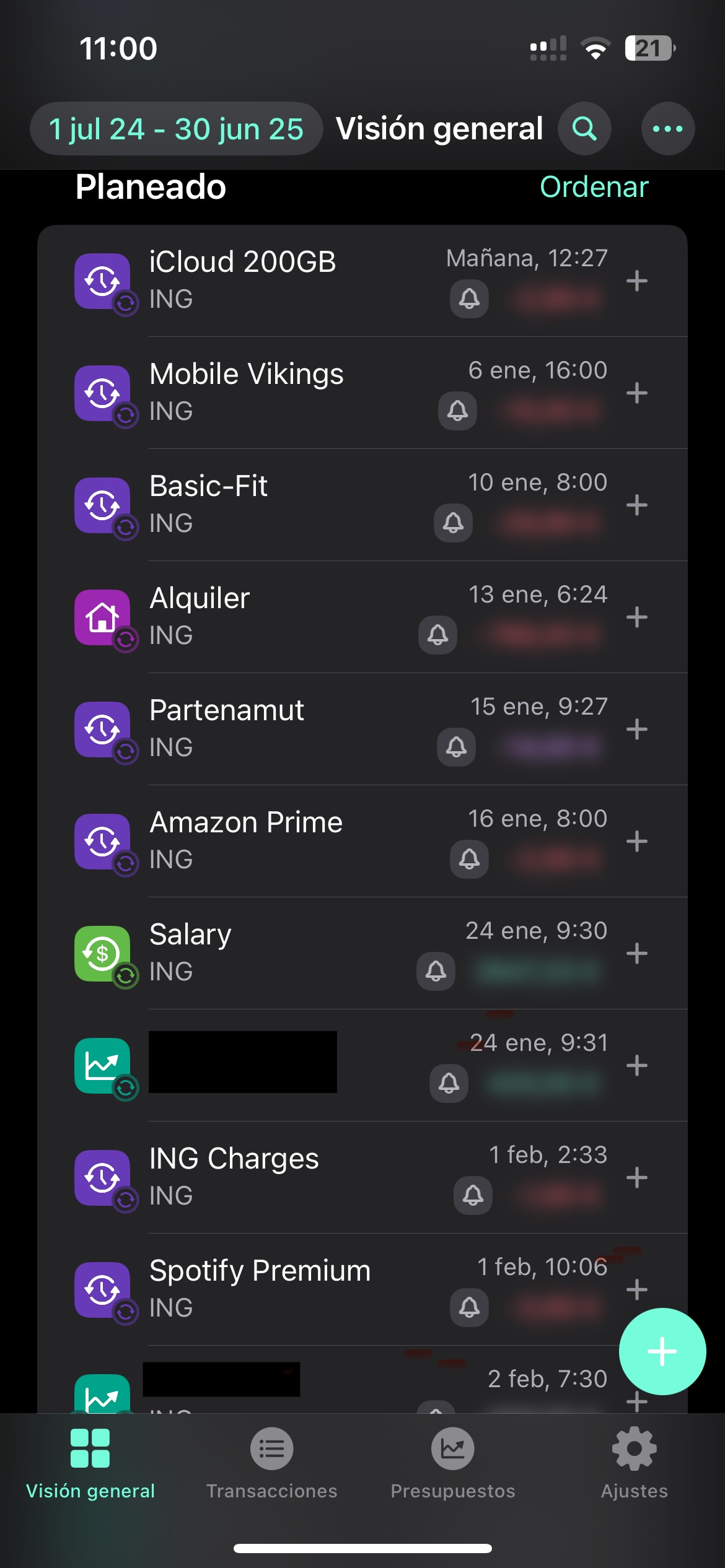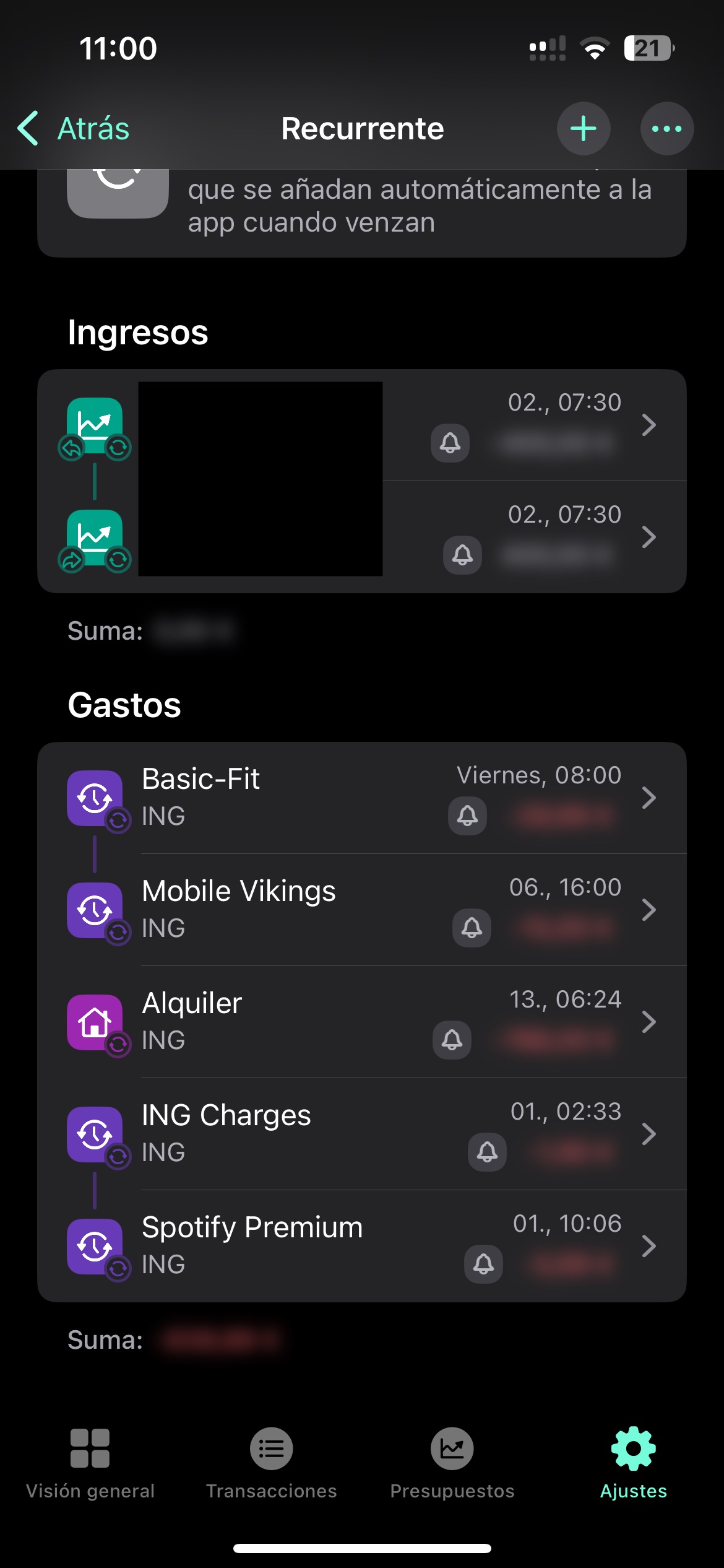 Recurrent transactions section: