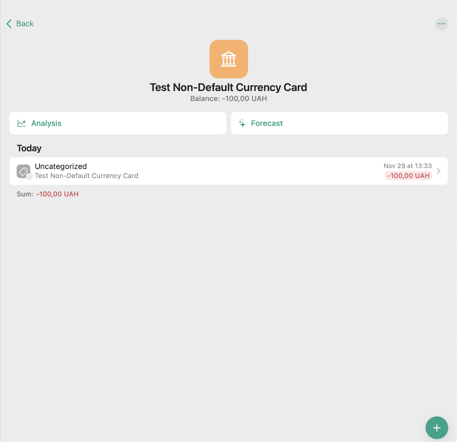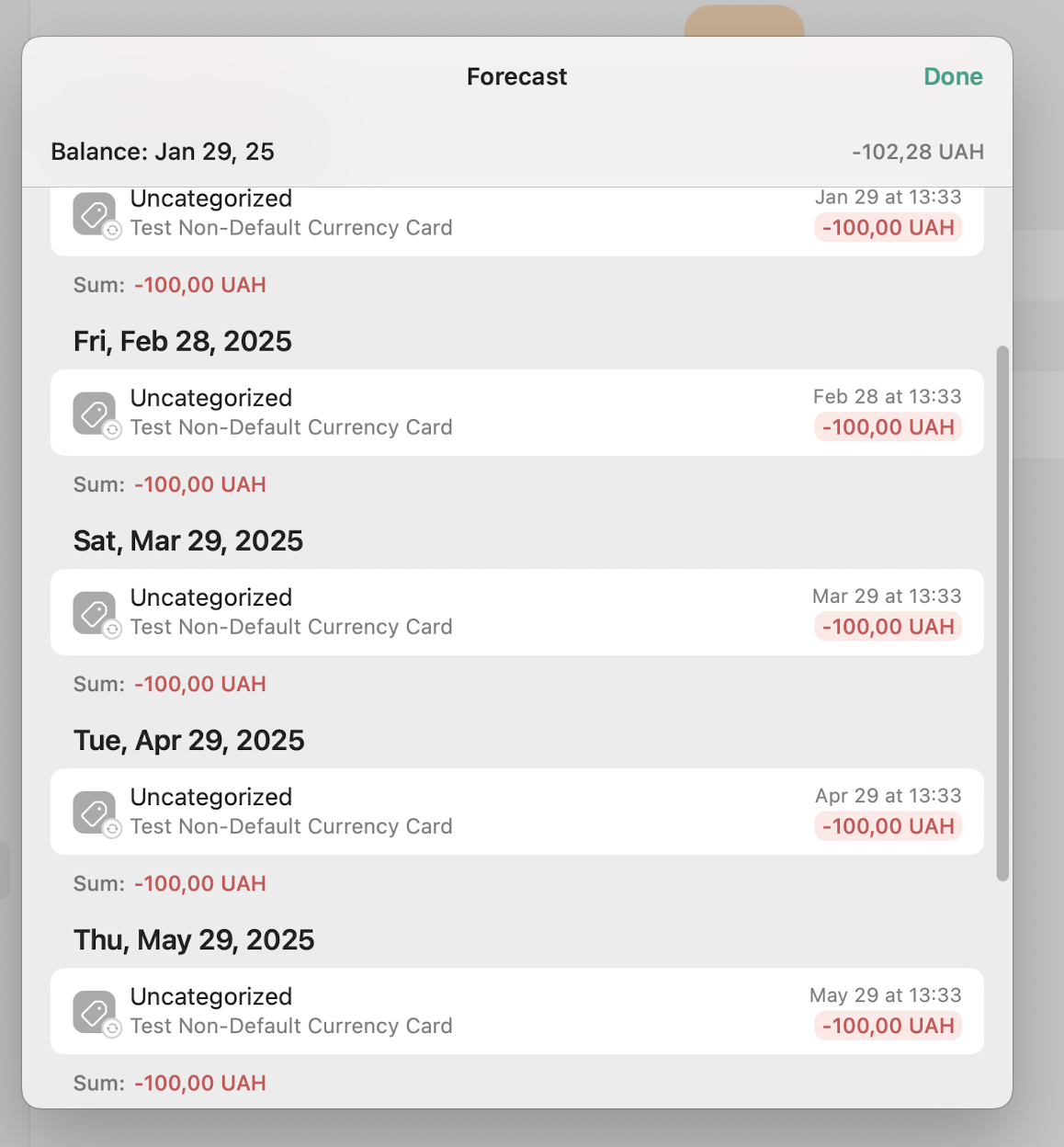 Itβs seems like in the forecast itβs taking the current balance in UAH (-100), then converts the upcoming transaction from UAH to EUR (100*exchange_rate=2.28) and substracts the value from the current balance, leading to -102,28UAH being a forecasted balance, while the actual expected value should be -200UAH.