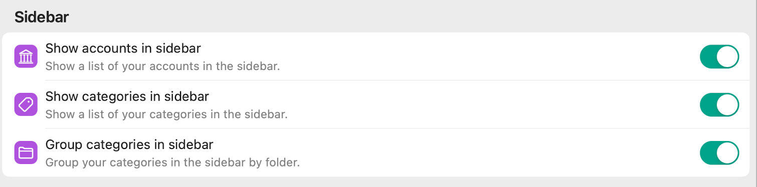The one long list of accounts doesn’t look good when viewed. Just like categories, we should be able to group the accounts by type.